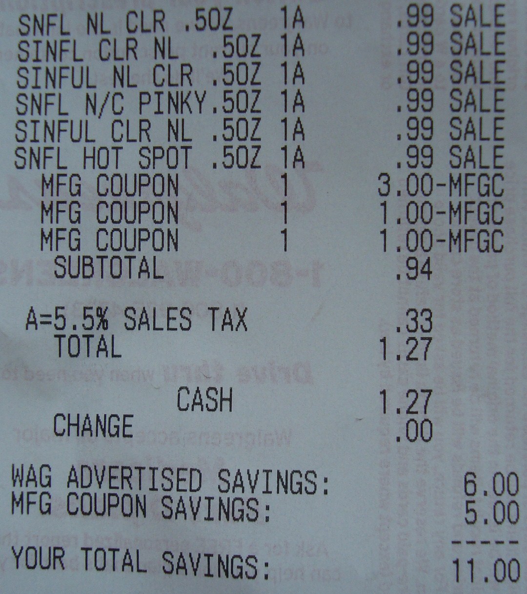 Here I picked up six Sinful Colors polishes in this transaction and only paid $1.27 for all of them! I used my $3 in Register Rewards and two of my $1 Register Rewards I had saved from buying my Herbal Essences shampoo last week. So- to sum it all up- I paid under $3 for seven nail polishes!